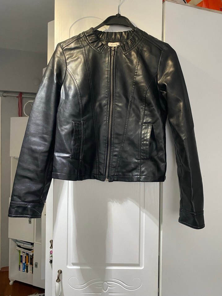 Kadınlar için oturan kesime sahip siyah deri biker ceket, yakasında çıtçıtlı detaylar bulunur. Uzun kollu ve midi boydadır, günlük kullanıma uygundur.