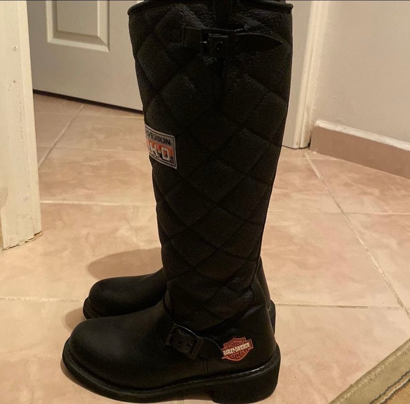 Siyah deri diz boyu biker botlar, tokalı kayışlar ve kalın topuklu. Trendy gündelik tarz ve günlük kullanım için uygundur. 36 numara