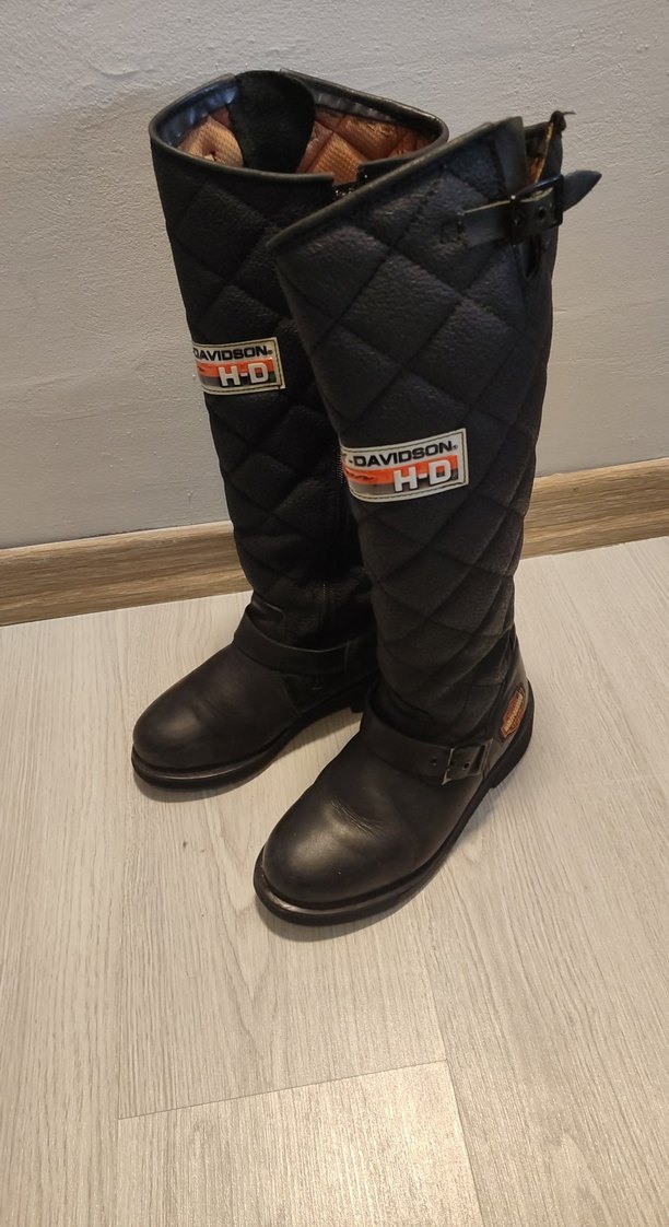 Siyah deri, dizüstü biker botlar, yüksek topuklu ve tokalı detaylara sahip, "H-D" logosuyla sokak stilini yansıtıyor.