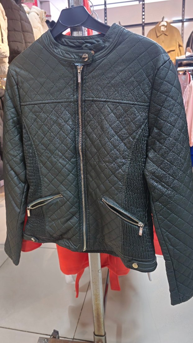 Kadın siyah deri biker. Düzenli kesim, kapitone detaylı ve askılı kolludur, sokak stili için uygundur.