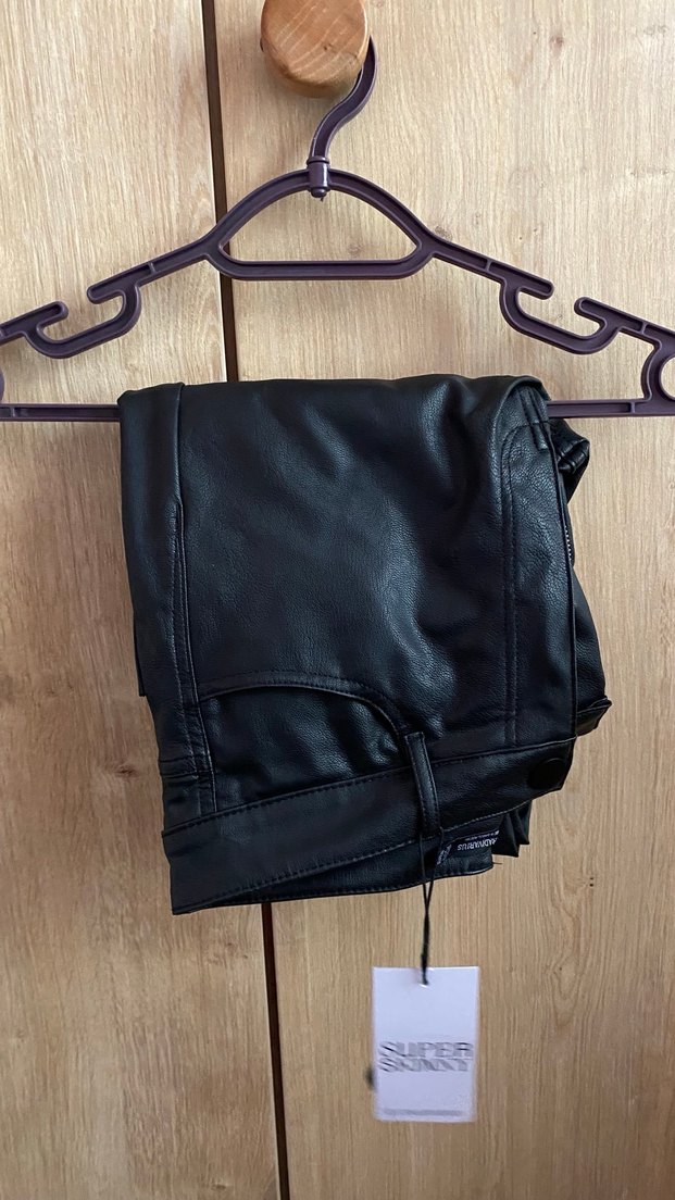 Siyah, deri, biker tarzı, oturan kesim, tokalı ve midi boy kadın pantolon.