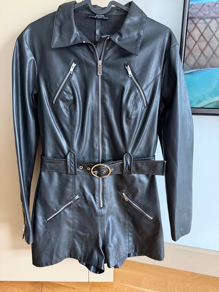 Siyah deri biker tulum, yakasında çentikli yaka, fermuarlı cep ve belde tokalı kemerle dikkat çekiyor. Uzun kolları askılı detaylı, Paris tarzı ve günlük kullanıma uygun.
