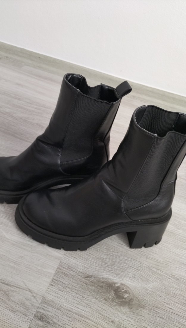 Siyah deri kadın botları, blok topuklu ve minimalist goth tarzında. Günlük kullanım için uygun, zahmetsiz şıklık sunar.