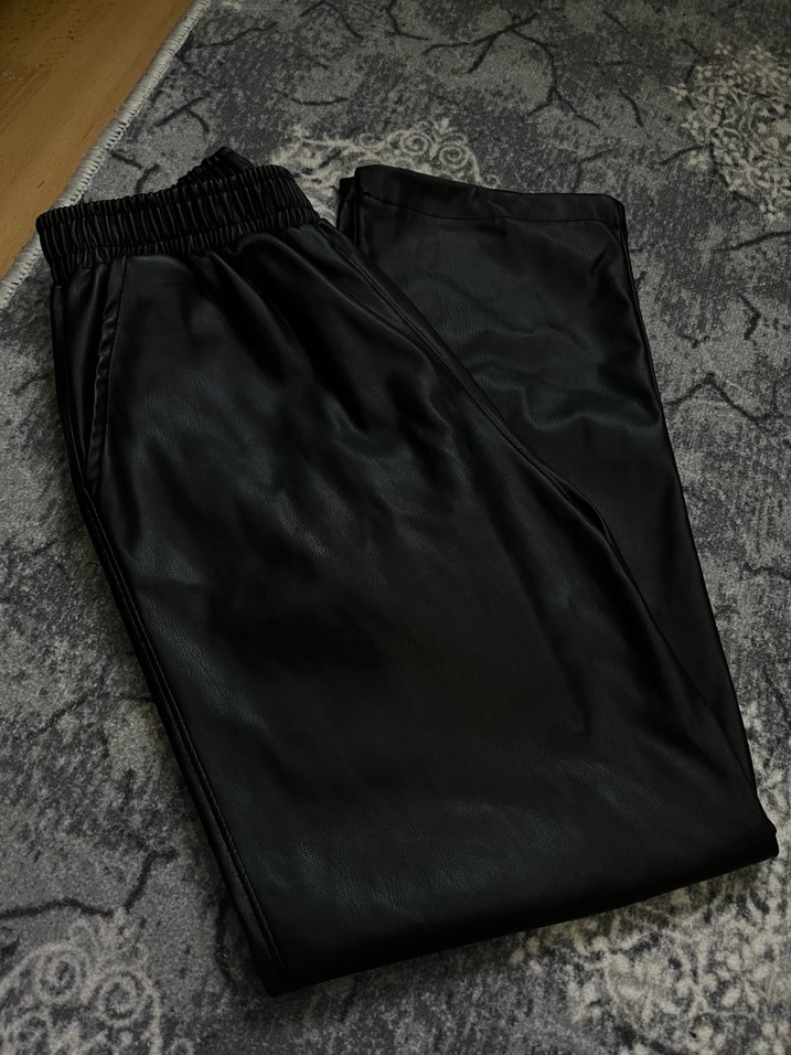 Siyah deri, kemerli, bol kesim midi boy, deseniz pantolon. Rahat sokak stili ve günlük kullanım için uygundur.