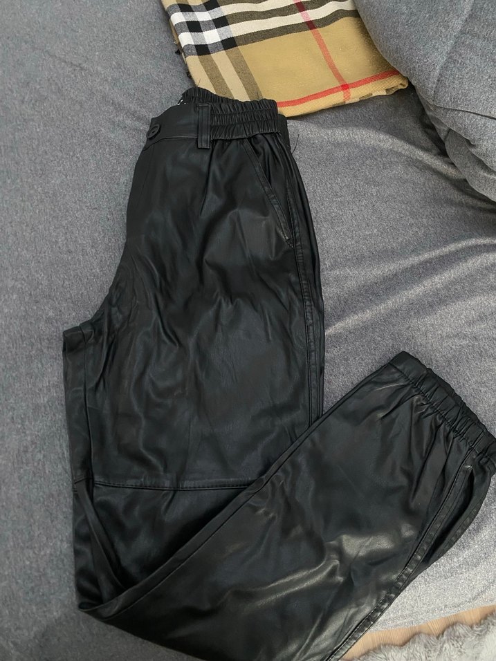 Kadın Siyah Deri Bol Kesim Kemerli Pantolon