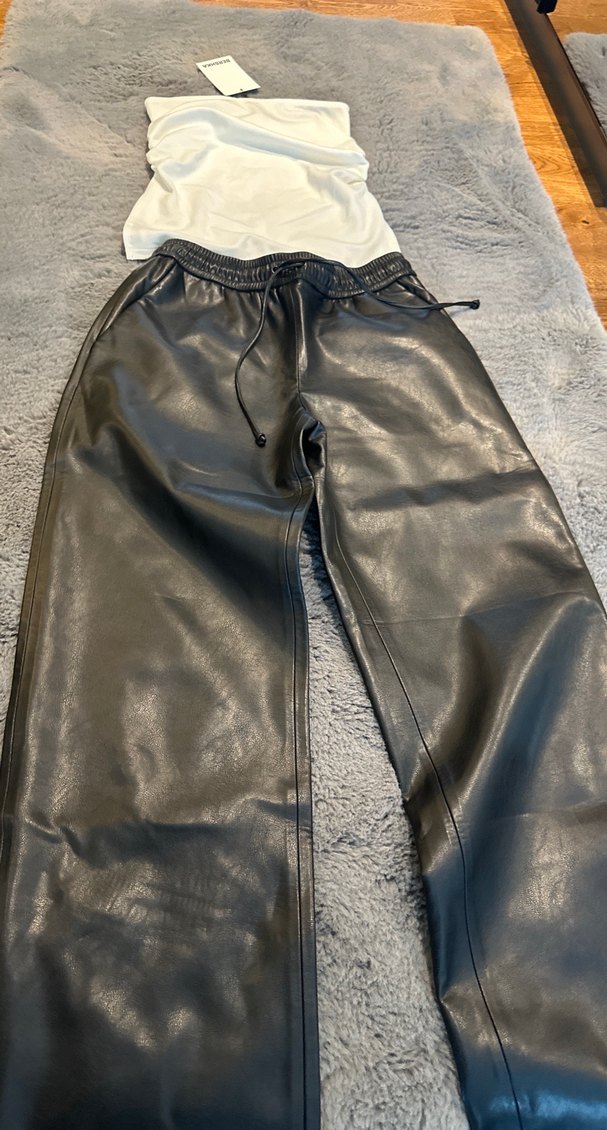 Siyah deri, bol kesim, pantolon. Düz ve desenli olmayan tasarımıyla günlük kullanıma uygun. Bedeni xs ama m beden kullanabilir