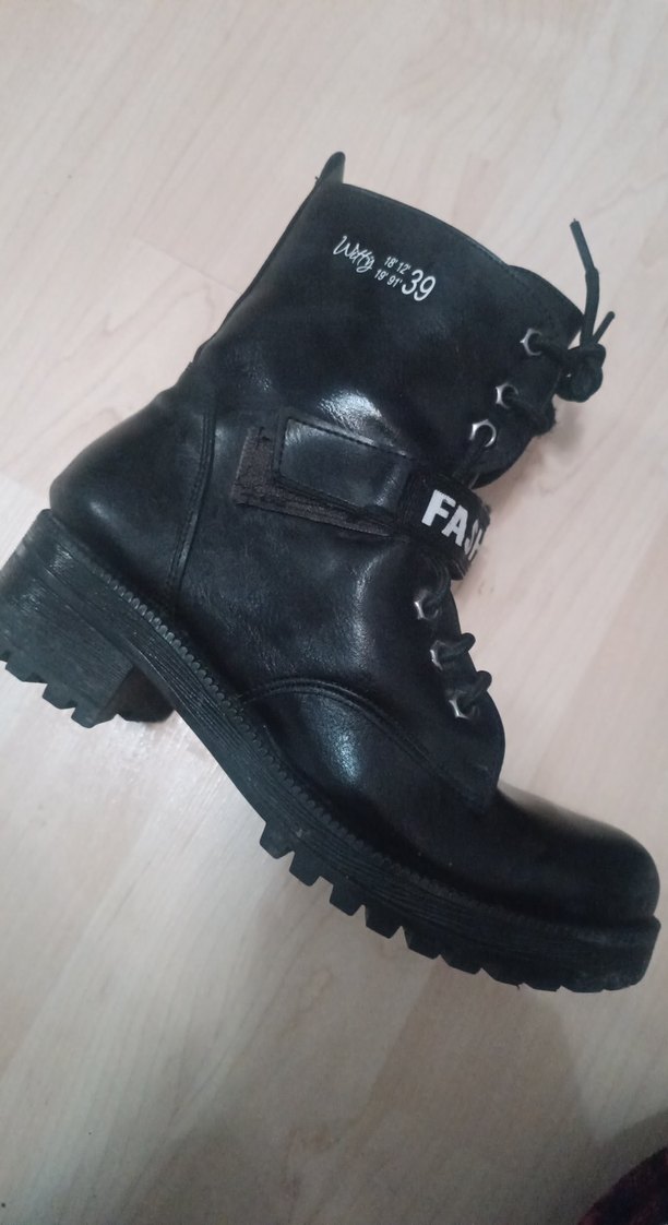Siyah deri kadın bot, kalın topuklu ve tokalı, baskılı desene sahip internetten aldım büyük geldigi için satıyorum.