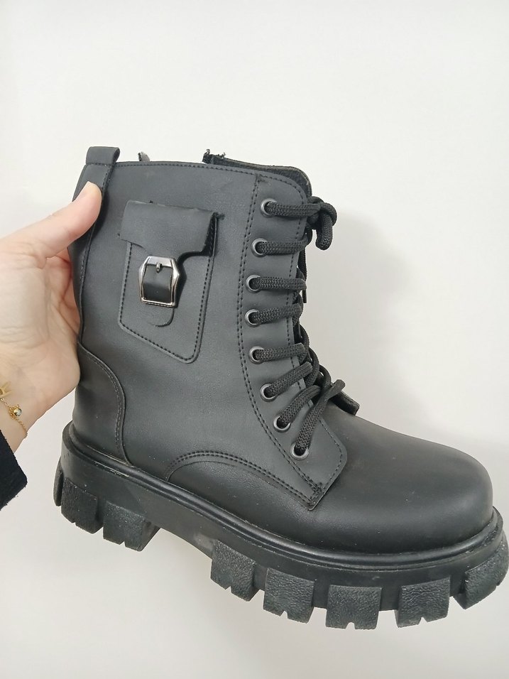 Siyah deri bot, tokalı detaylar ve kalın blok topuklu. Kamuflaj desenli, günlük kullanım için uygun. Birkez giyildi yeniden farksız.