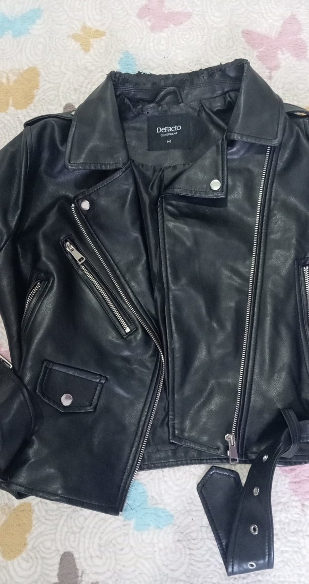 Fitted kesim siyah deri biker ceket, ense kısmında soyulma var saçlarınızla kapatabilirsiniz onun haricinde sorunu yok