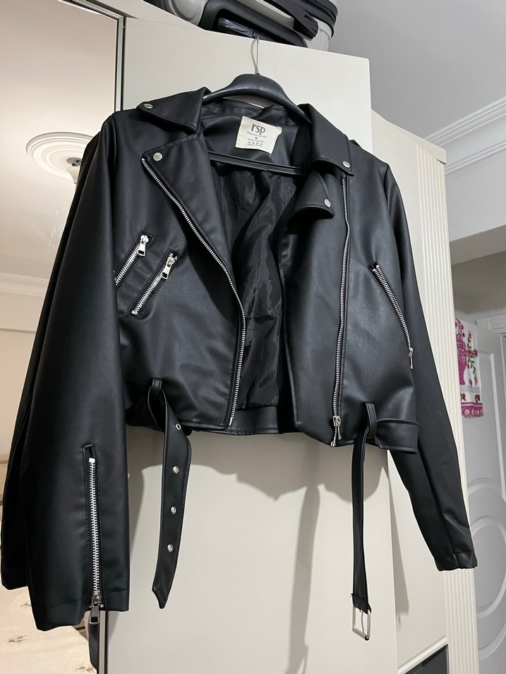 Siyah deri, kemerli, notalı yakalı ve askılı kollu, dar kesim biker ceket. Trendy casual tarz için uygundur.