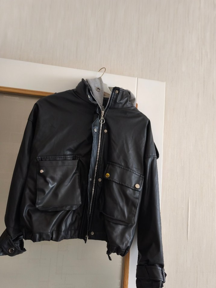 Siyah deri, yüksek yakalı ve detaylı, bol kesim, geniş ön cepli kadın ceket.