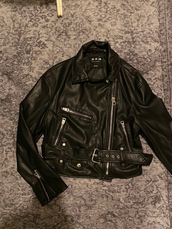 Fıtlı siyah deri biker ceket, kemerli bel, kesik yaka ve askılı kollara sahiptir. Çoklu fermuarlı ceplerle grunge punk havası verir.