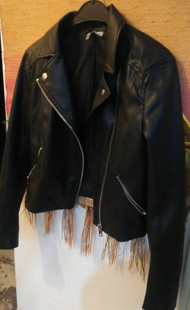 siyah deri ceket, kesimli ve Fermuarlı detaylar ve askılı kollara sahiptir, sadece dikkat çekmiyor deri döküntüsü var ama küçücük dikkat çekmiyor