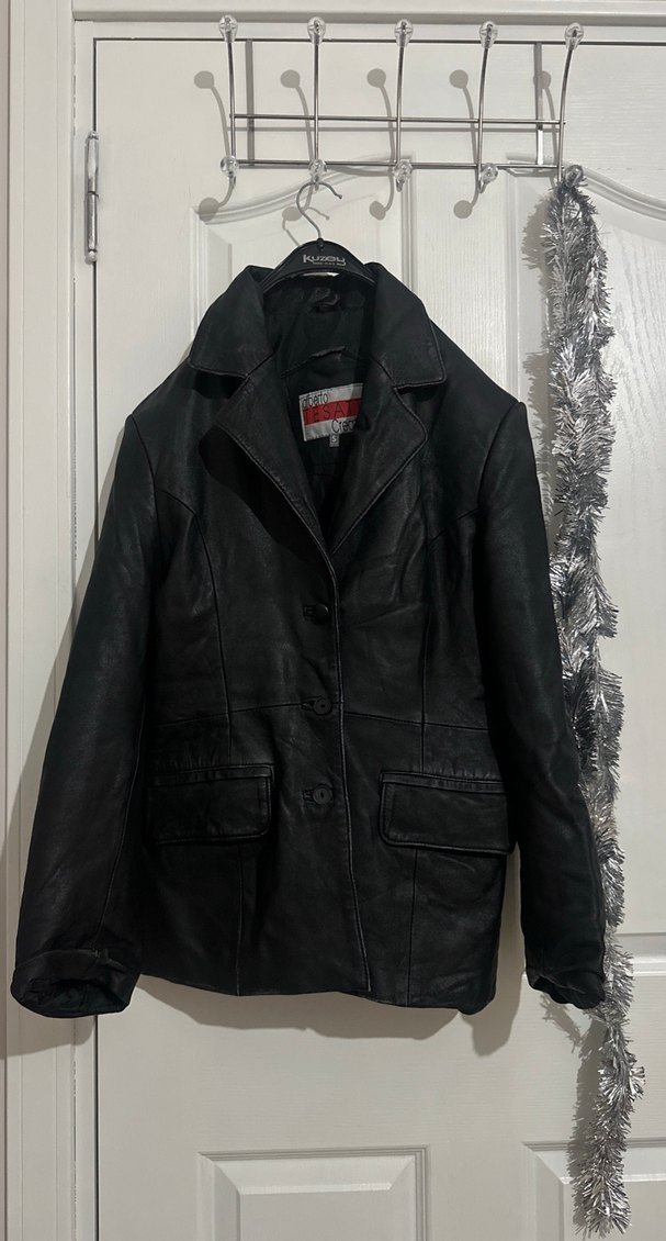 Siyah deri, kürklü detaylı, kesik yakalı, uzun kollu, normal boy kadın ceketi. Ofis ortamına uygun goth ve grunge punk tarzında.