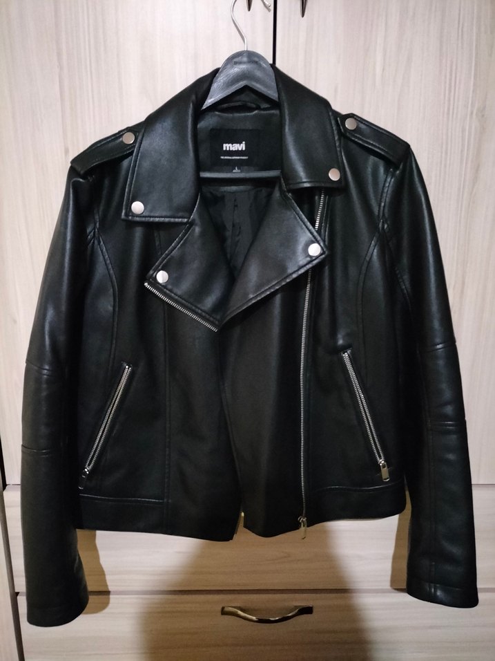 Siyah deri biker ceket, normal kesim. Askılı kollu, midi boyda, günlük kullanım için uygun. Marka: Mavi.
