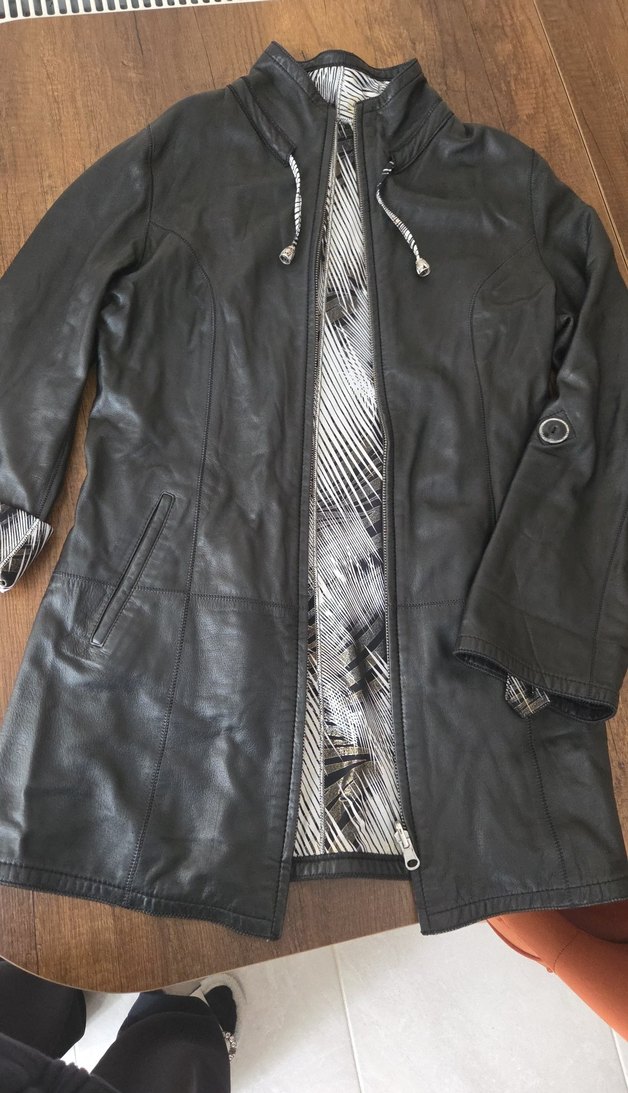 Kadın hakiki deri ceket, kesik yakalı ve fermuarlı ön kısmıyla dikkat çekiyor. Uzun kollu ve regular fit, günlük sokak stili için uygun. İç kısmı desenli astarlıdır.