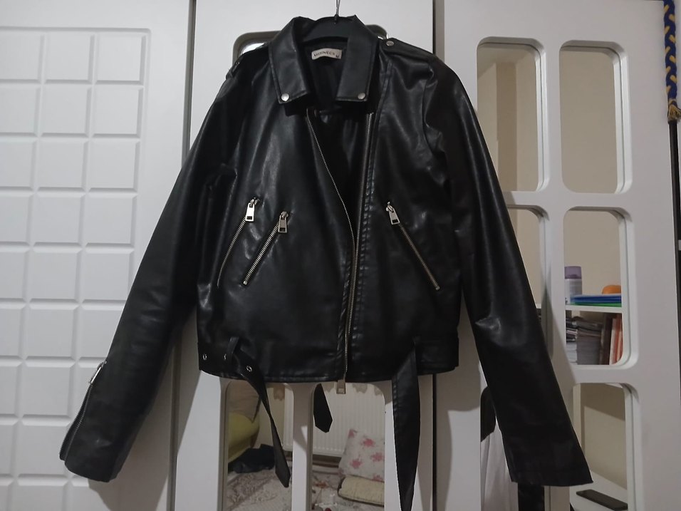 Siyah, fitted kesim deri biker ceket, notched lapel ve tokalı detaylarla rock punk havası taşıyor. Günlük kullanım için ideal, fermuarlı ceplidir.
