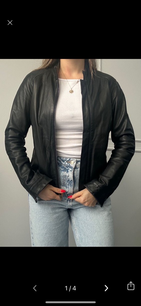 Kadınlar için siyah, dar kesim deri ceket. Uzun kollu, yuvarlak yakalı ve günlük kullanıma uygun normal uzunlukta.