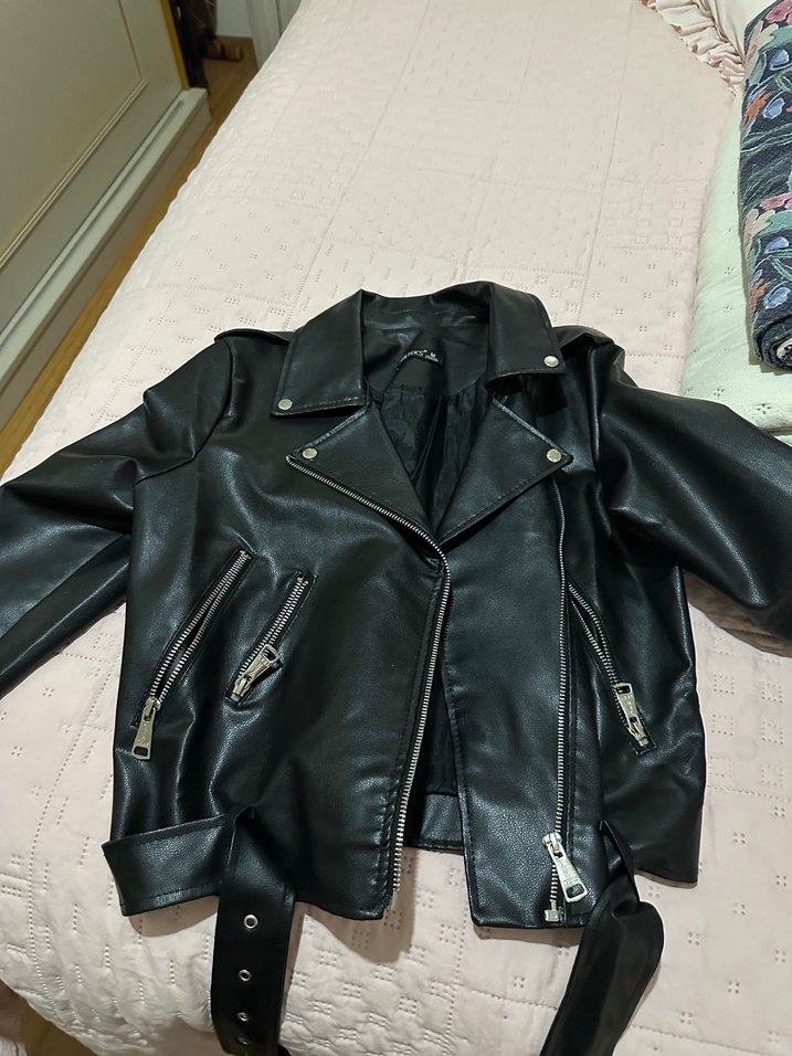 Kadınlar için siyah deri biker ceket, fitted kesim, kesik yaka ve tokalı detaylara sahip. Askılı kollu ve midi uzunlukta, grunge punk tarzını yansıtıyor. Suni deri ceket deformesi yok dar kalıp belde biter m beden 50/55 kilo arası giydim şuan olmadığı için satıyorum