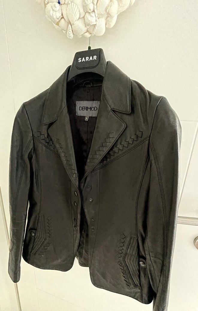 Siyah deri ceket, keskin yaka ve düğmeli ön detaylarıyla klasik goth tarzını yansıtır. Kısa boy, regular fit ve askılı kollara sahiptir. Ofis için uygundur.