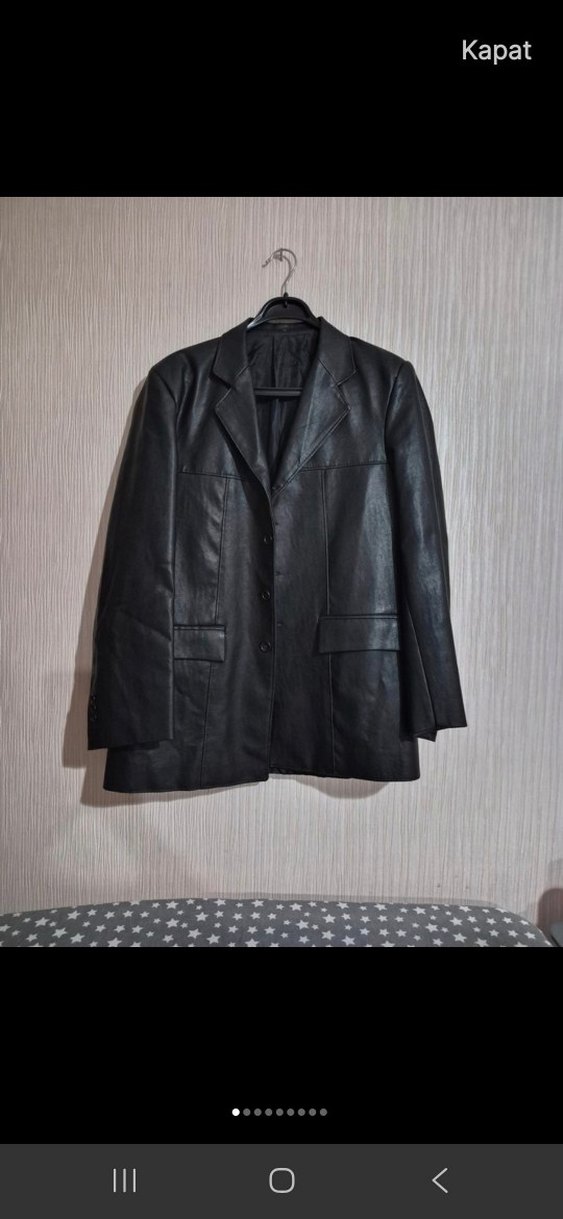 Kadın siyah deri ceket, düğmeli, normal boyda, uzun kollu, keskin yakalı ve sade tasarımlı. Ofis ve sokak stiline uygun şık parça.