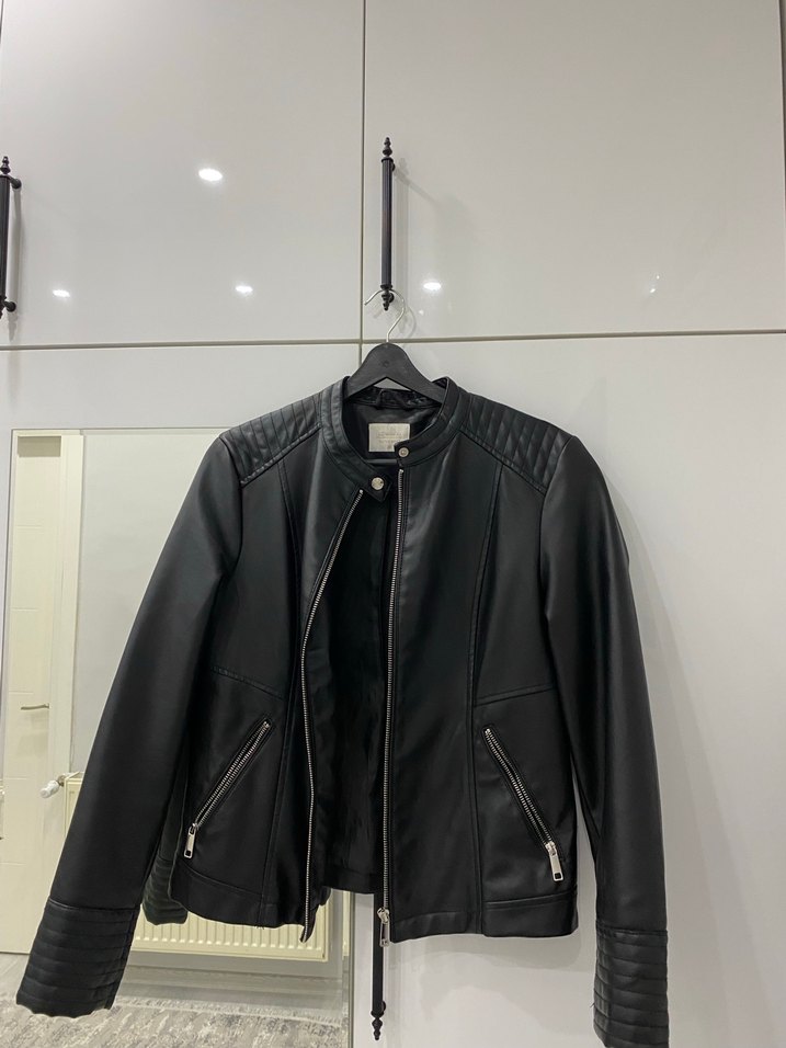 Siyah deri biker ceket, kesik yakalı ve uzun kolludur. Minimalist tasarımda, normal midi boyda ve rahat kesimdir. Günlük kullanıma uygundur.
