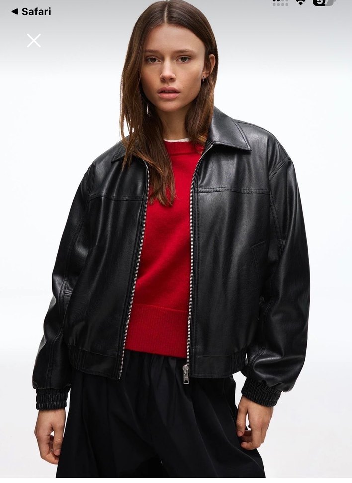 Bu siyah deri ceket, rahat kesimi, uzun kollu ve bisiklet yaka tasarımıyla günlük kullanıma uygundur. Normal boyu ve desensiz yapısıyla zahmetsiz şıklık sunar. "4Safari" yazısı görünür.
