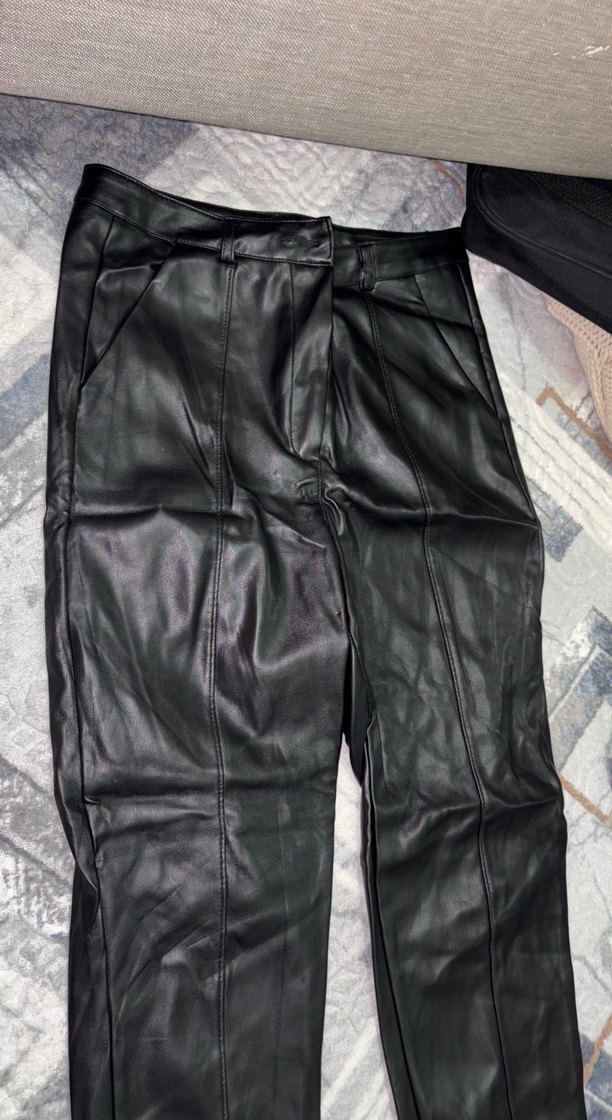 Siyah deri dar kesim midi pantolon, tokalı detaylara sahip, sokak stili ve günlük kullanım için uygun. İçi süettir sıcak tutar