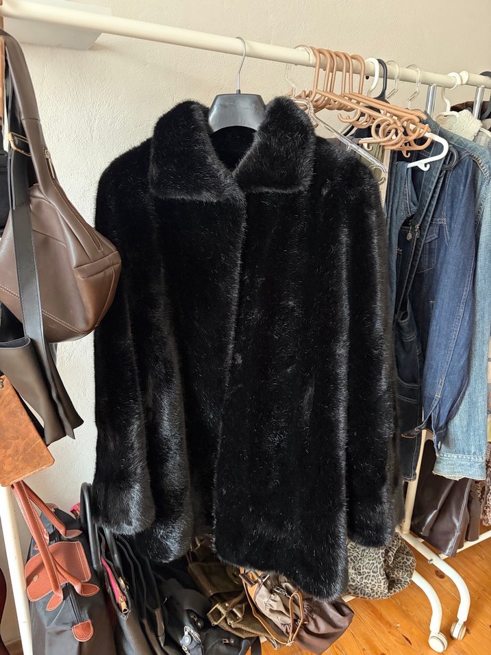 Kadınlar için siyah deri ve kürk detaylı, bol kesim uzun kollu midi boy ceket. Rahat ve sıcak tutan goth tarzında tasarlanmıştır.
