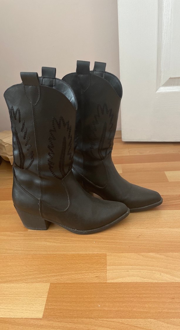 Siyah deri diz boyu botlar, kalın topuklu ve tokalı, bohem stilde günlük kullanıma uygun.