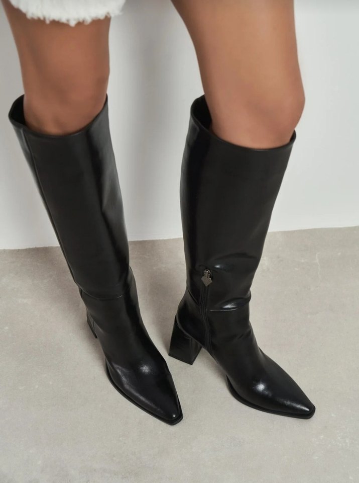 Siyah deri, blok topuklu dizüstü botlar, cesur ve minimalist tarzı ile günlük kullanıma uygundur.Nişantaşı Shoes markadır .