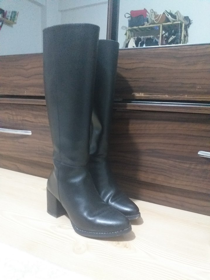 Siyah deri dizüstü botlar, blok topuklu. Minimalist gotik tarzda, günlük kullanım için uygundur.