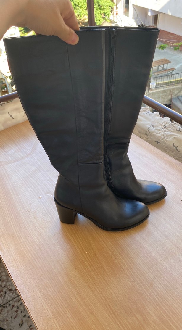 Kadın Siyah Deri Dizüstü Botlar, Tokalı, Kalın Topuklu