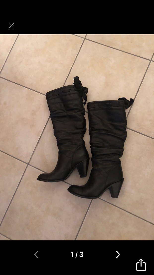 Siyah deri dizüstü botlar, blok topuklu ve tokalı detaylıdır. Günlük kullanıma uygun, desen içermeyen şık bir model.