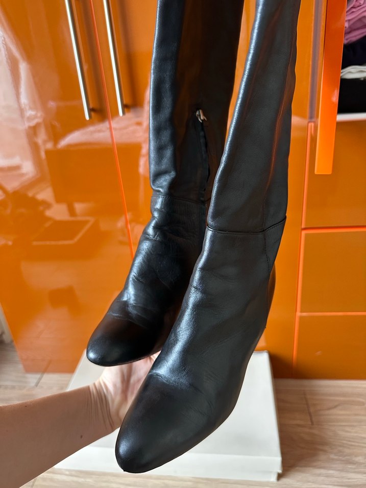 Siyah deri dizüstü çizmeler, topuklu bir iki kez giyildi yepyeni şık bir tarz