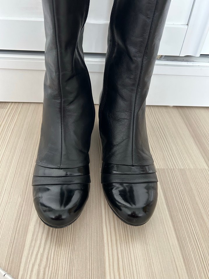 Siyah deri dizüstü çizme, stiletto topuklu. Desensiz, modern ofis stiline uygundur. 39 numara bir iki defa giyildi ayağına küçük geldiği içşn satıyorum hakiki deri Kemal tanca marka kutusuyla gönderilecektir içi polarlı rahat bir çizme topuğu küçük olduou içşn kullanımı rahattır