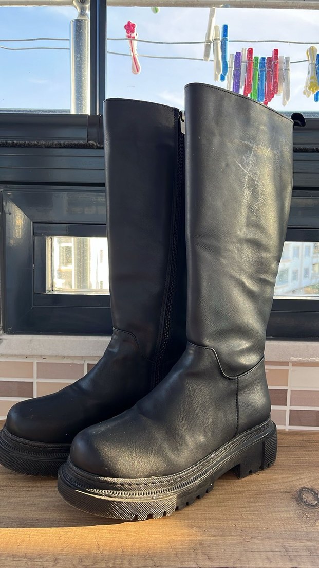 Siyah deri, dizüstü, tokalı goth stile sahip kadın botu, blok topuklu ve günlük rahat kullanıma uygun.