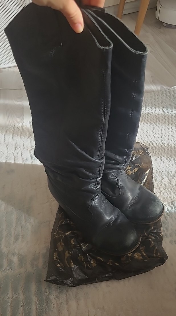 Siyah deri dizüstü botlar, dolgu topuklu ve tokalı detaylı, gotik tarzda, günlük kullanım için uygundur. hiç bir kusuru ve açılması yok sadece boyayarak kullanabilirsiniz artık benim ayağıma uymuyor