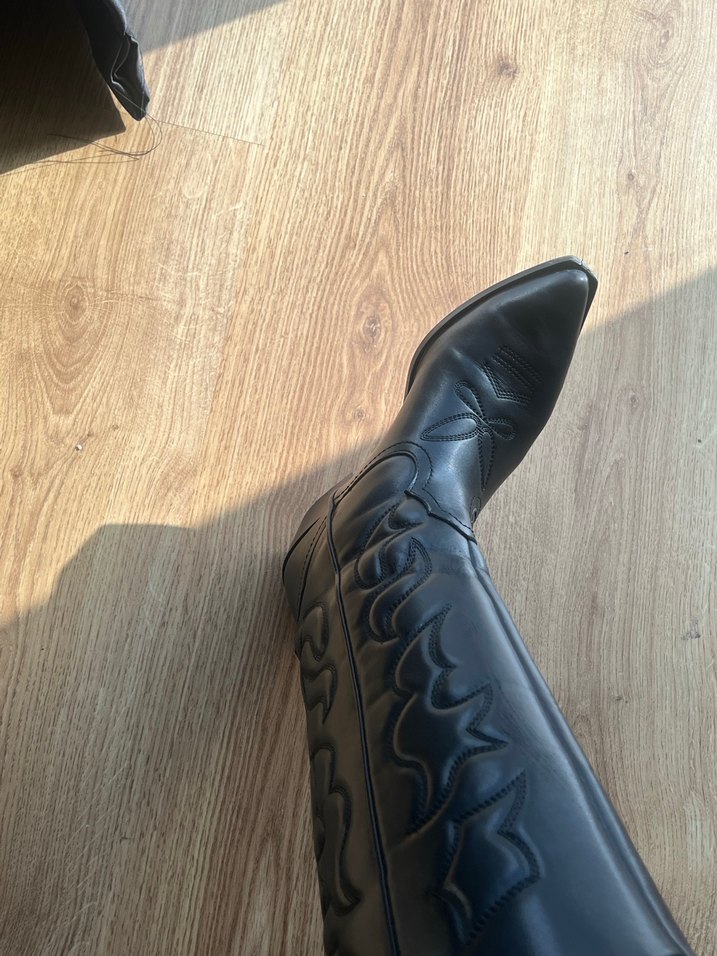 Siyah deri dizüstü botlar, stiletto topuklu ve tokalı, minimalist ve karşı kültür tarzında günlük kullanım için uygundur.