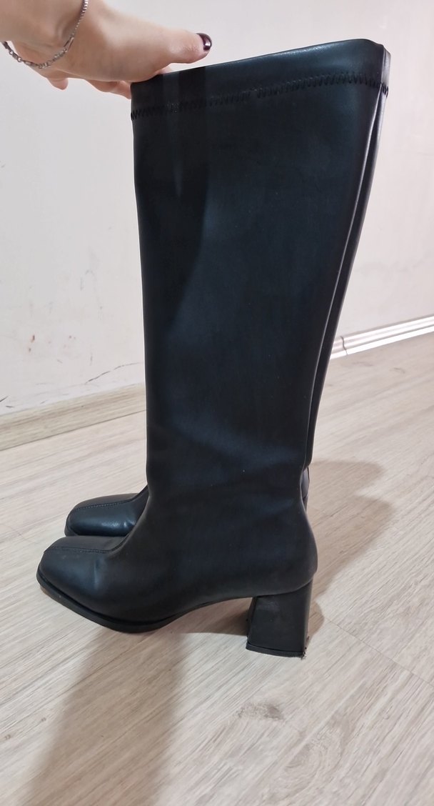 Siyah deri, kalın topuklu, kare burunlu, desensiz günlük kullanım için uygun çizme. Birkaç kez giydim bacaklarımı sıktığı için elden çıkarıyorum. Marka temsili.