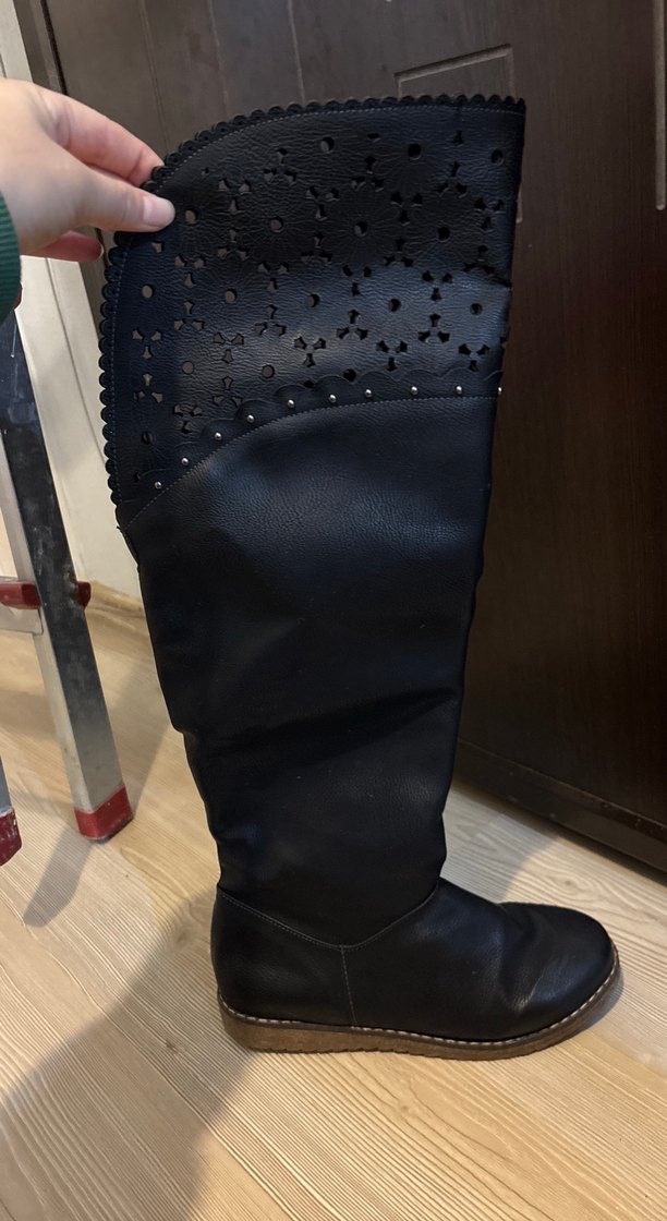 Siyah deri dizüstü tokalı çizme, gotik ve şık tarz için uygun, günlük kullanım rahatlığı sağlar. Çok fazla giyilmedi