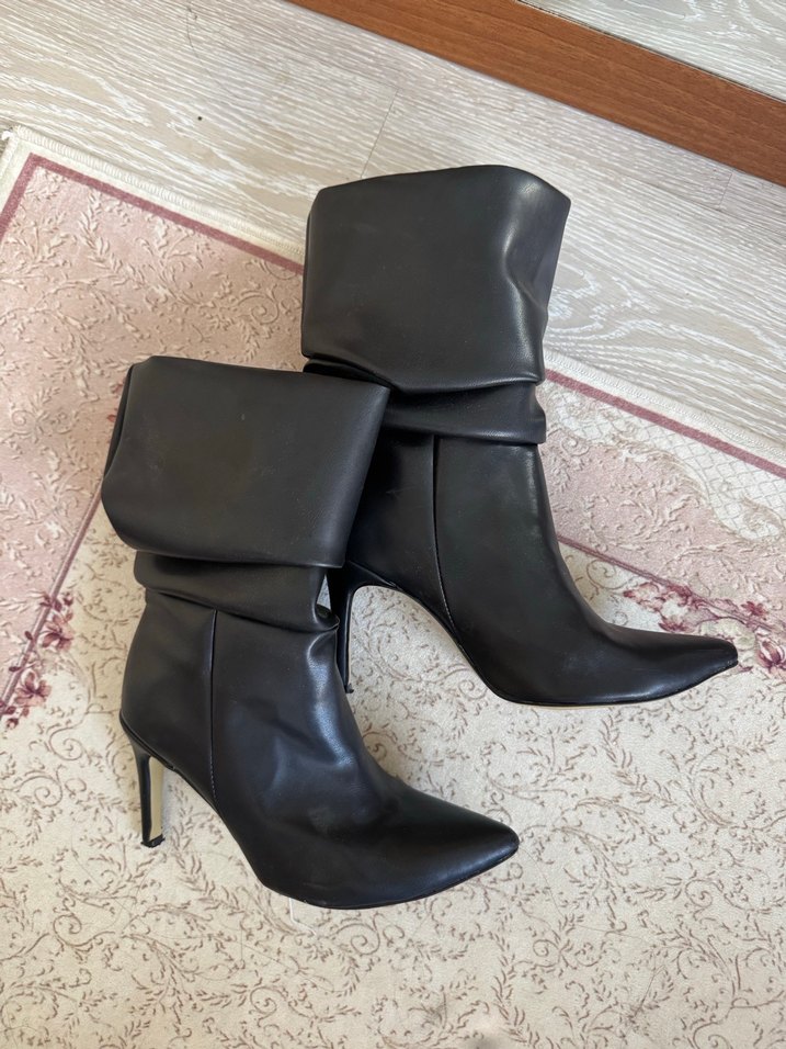 Siyah deri dizüstü çizme, ince stilettolu topuklu ve tokalı detaylı. Ofis için uygun, klasik ve çağdaş Paris tarzını yansıtan desensiz model.