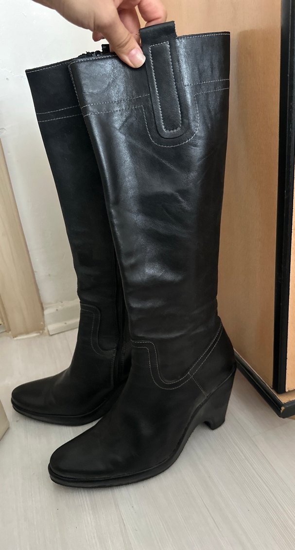 Siyah deri dolgu topuklu, tokalı dizüstü çizme, şık gotik tarzıyla trend günlük kullanıma uygundur. 2-3kere giyilmiştir en fazla altından da gözüktüğü gibi kutulu gönderim yapılacaktır
