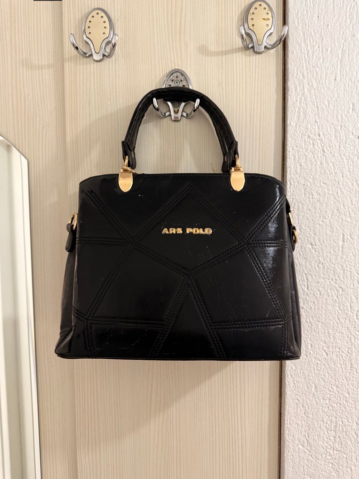 Siyah deri kadın çantası, modern klasik tarzda, baskılı detaylar ve tokalı süslemelere sahip, günlük kullanıma uygun. Cesur Paris havası taşır.