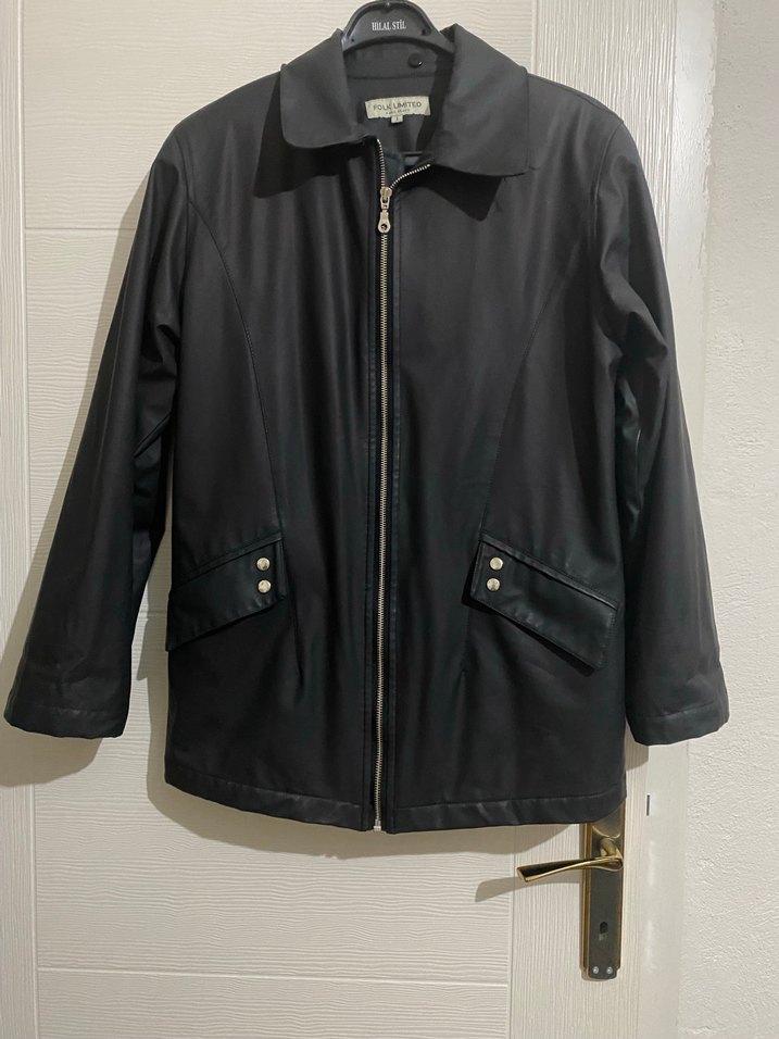 Kadın siyah deri fermuarlı ceket, kesik yakalı, uzun kollu ve midi boydadır. Ofis için uygun, klasik ve şık bir tarza sahiptir.