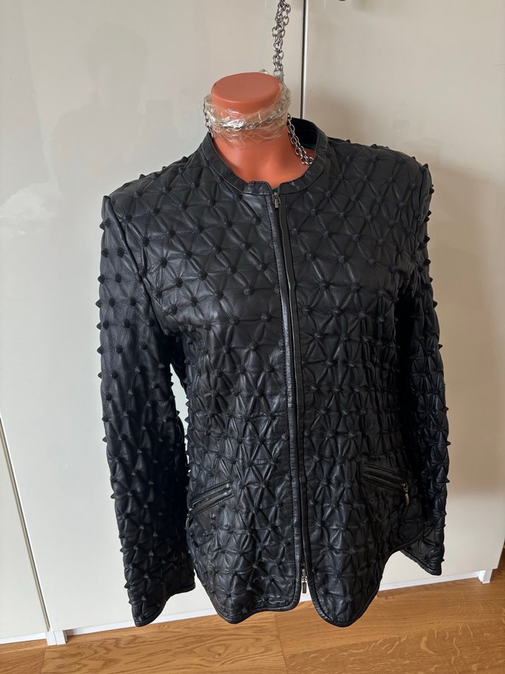 Sayılı kullanılmıştır. 100% kuzu derisi. Beden 40 ölçüleri göğüs 106 uzunluk 65 kol 60 iki omuz 42 cm. Plastik manken 34 beden 82-58-82 ölçülerinde. Dokusu orijinal, fermuarları sağlam, astarlı, cepli model Fermuarlı, strappy kollu, yaka detaylı siyah deri kadın ceket. Midi boyda ve dokulu desensiz, günlük kullanıma uygun.