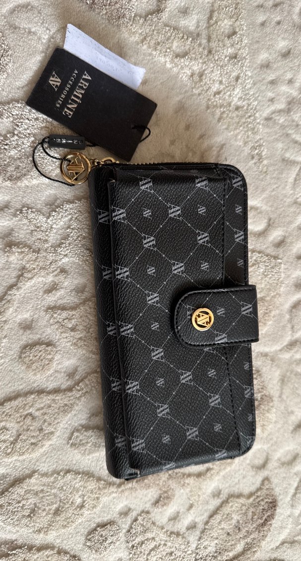 Kadın siyah deri clutch cüzdan, fermuarlı bölmesi ve ARMINE yazılı baskılı deseniyle klasik şıklığı sokak modasıyla buluşturur.