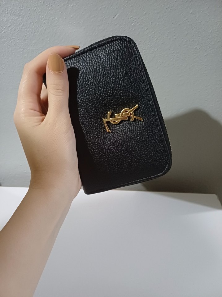 Siyah deri, fermuarlı kadın cüzdanı, baskılı desene ve parlak görünüme sahip. Günlük kullanıma uygun, klasik Paris sokak stilinde.