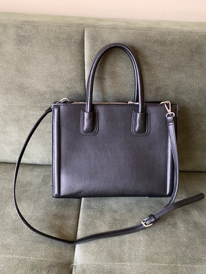 Siyah deri çanta, fermuarlı kapanış ve desensiz tasarıma sahiptir. Kulplu ve ayarlanabilir askılı, günlük kullanıma uygun klasik ve modern tarzda.