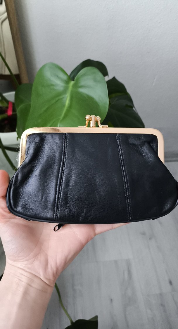Siyah deri fermuarlı portföy cüzdan, modern klasik tarzda, günlük kullanıma uygun, desen içermeyen ve vintage esintili metal çerçeve kapamalı.